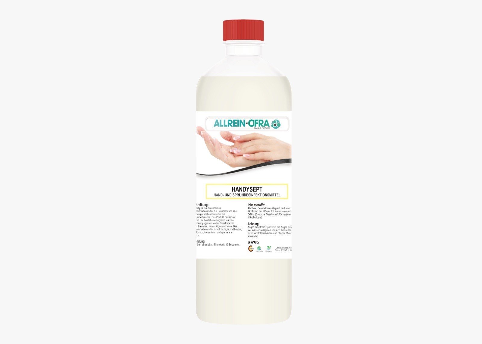 Hochwertiges, hautfreundliches Handdesinfektionsmittel für Haushalte und alle Berufszweige, insbesondere für die Lebensmittelbranche. Das Produkt basiert auf Alkoholen und besitzt eine begrenzt viruzide Wirksamkeit gegen ein weites Spektrum von Keimen, Bakterien, Pilzen, Algen und Viren. Das Handdesinfektionsmittel ist voll biologisch abbaubar, wasserlöslich, konzentriert und sparsam im Gebrauch.